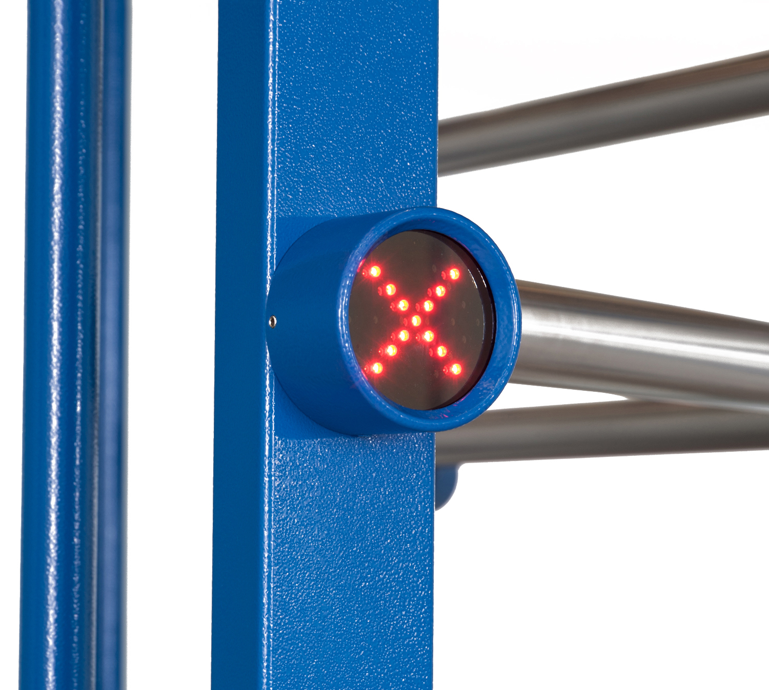 Турникет снабжен встроенными световыми индикаторами разрешения и запрещения прохода со сверхъяркими светодиодами. Есть возможность подключения дополнительных выносных световых индикаторов.