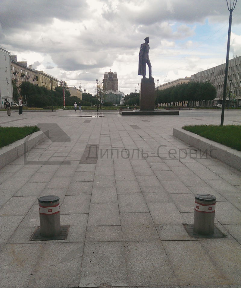 В 2016 г. завершились работы по благоустройству площади. После чего у заказчика возникло желание оградить территорию от автомобилей. Можно было бы установить бетонные стойки или полусферы, но тогда затруднился бы доступ служебного автотранспорта. Шлагбаум не подходит, потому что портит внешний вид территории и мешает проходу посетителей. Поэтому мы установили электромеханические болларды.